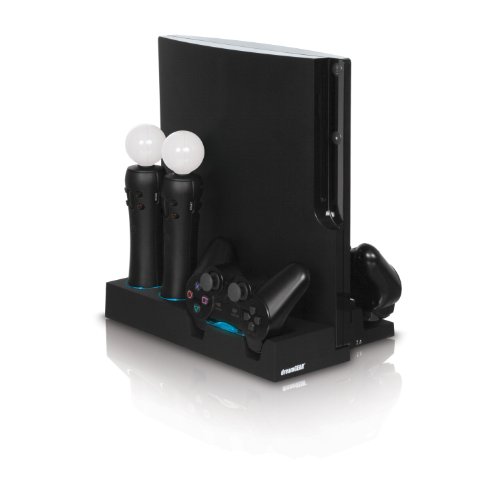 A vertical stand for your PS3 Slim that provides you with a complete charging solution for all of your PS3 accessories. Charges up to 2 Sixaxis or DualShock3 controllers, 2 PlayStation Move motion controllers and 2 PlayStation Move navigation controllers. Connects to your PS3 Slim via USB to provide you with 4 additional ports to connect or charge your PS3 accessories or other USB powered devices such as a PlayStation Eye, headset, keypad, iPod or iPhone. Includes LED charge indicators, a rubberized finish and a 110/240 volt AC adapter that features 5 amps of power that allows you to charge all of your devices simultaneously.