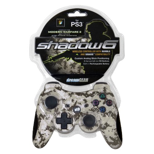 Limited edition camouflage perfect for Modern Warfare 2. Shadow 6 features a complete custom set of analog sticks, latency-free wireless technology, dual rumble motors, Sixaxis Motion Control, built-in rechargeable battery, enhanced L2/R2 buttons and rubberized grips to make it the most comfortable and feature-filled PS3 controller ever created. Trilingual (English, Spanish & French) packaging and User’s Guide.