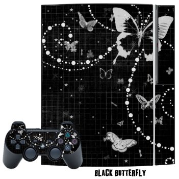 Protective Skin Decal Cover Sticker for Playstation 3 Console + two PS3 Controllers - Black Butterfly