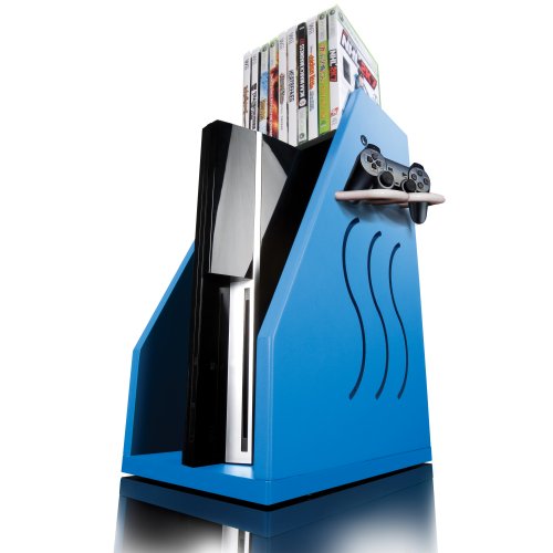 The flagship product of the GameOn(tm) line is designed to be an all-in-one video gaming storage system. GameOn(tm) is your answer to decreasing the challenge of "video game clutter" whether it's in a bedroom, family room or a crowded Dorm room. The GameOn(tm) storage system vertically supports all of today’s hottest video game consoles and can be used on a table top or easily mounted to the wall to free up space. The GameOn(tm) supports up to 25 pounds when properly wall-mounted. The upper shelf stores games and software while the four side support handles organize up to 4 hand controls and guitar accessories. Sleek "S" curves on the sides of the unit provide ventilation to the console when games start to really heat up! Available in your choice of black, white, red, blue, yellow or green to look cool in any room. GameOn(tm) is responsibly finished with safety certified paint and comes with a limited lifetime warranty.