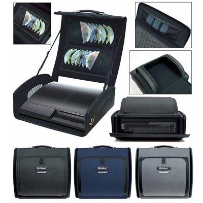 MODEL- 77001 VENDOR- NAKI WORLD FEATURES- G-Pak Console Organizer PS3 Organizes and safely stores: 1 PS3 Game Console 2 Controller Pads 24 DVD CD or Game Discs 4 Memory Cards Game Instructions and manuals All connection link and power cables. Includes removable 16 disc holder. Velcro straps securely fasten console in place for travel and when playing DIRECT FROM THE CASE. Customized fan vents allow proper console cooling. Reinforced case walls and padded inner lining provide protection and security for travel. Excessively sturdy carrying handle with comfortable adjustable shoulder strap.